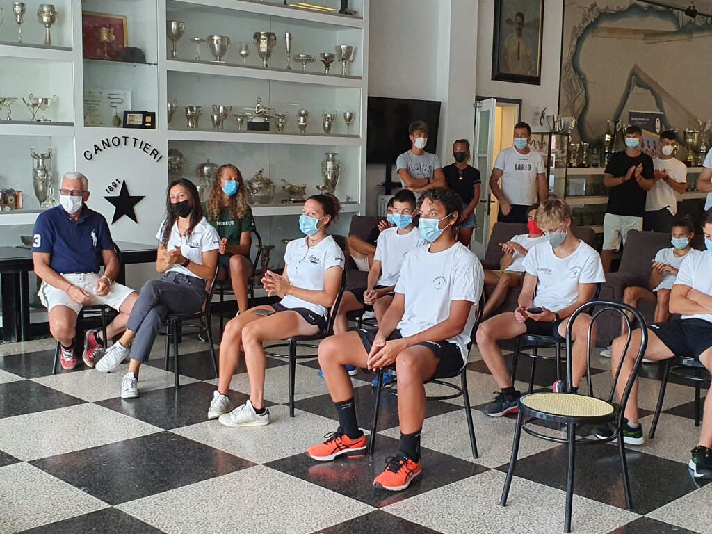 14 luglio 2021 - Secondo step per la commissione presieduta da Achille Mojoli con la consegna delle borracce personalizzate agli atleti della Canottieri Lario a Como. Alla presenza e di Mariapia Roncoroni e Renata Soliani - componenti della commissione -, e dei panathleti Giovanni Tonghini e Maurizio Monego, dopo i saluti del padrone di casa Leonardo Bernasconi, del Presidente Panathlon Como Edoardo Ceriani, del District Manager di Banca Generali Guido Stancanelli (Banca Generali sostiene il Premio Panathlon Giovani più volte assegnato ad atleti della Canottieri Lario), gli atleti hanno ascoltato da Achille Mojoli le finalità del progetto "Etica per la vita - No alla plastica". La prima borraccia è stata consegnata a Greta Parravicini, premio Panathlon Giovani 2019, ritornata da poco con al collo la medaglia d'argento vinta ai mondiali under 23 di Racice, in Repubblica Ceca (per di più in una barca olimpica, il doppio pesi leggeri femminile). Ogni borraccia presenta il nome dell'atleta, i loghi del Panathlon Como e della Società, la dicitura "No alla plastica" e il logo della Mapei - un’azienda leader nel settore dell’edilizia che guarda con grande attenzione ai temi ecologici, all’impatto dei prodotti sull’ambiente e sulla salute - il cui sostegno ne ha permesso la realizzazione.