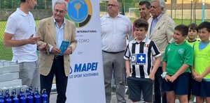 Terzo step, 24 novembre 2021 - Continuazione del service presso la sede dell’Esperia 2008 Lomazzo Calcio. Alla presenza del Presidente Luca Rossetti, del Consigliere e Fiduciario CONI Claudio Chiaratti, di genitori e piccoli atleti del 2014/2015, sono state consegnate 44 borracce personalizzate con il loro nome, i loghi del Panathlon Como e della Società - che nel 2017 aveva sottoscritto ufficialmente la Dichiarazione del Panathlon sull’etica nello sport giovanile -, la dicitura "No alla plastica" e il logo dell’azienda Mapei, il cui sostegno ne ha permesso la realizzazione. Dopo i saluti iniziali del Presidente Panathlon Club Como Edoardo Ceriani, il presidente della commissione Etica per la vita e sport sostenibile Achille Mojoli ha spiegato le finalità del progetto e il dr. Claudio Pecci, presidente della commissione cultura del Club e presente nella veste di rappresentante della proprietà Mapei, ha fatto conoscere ai ragazzi la lungimiranza e la passione dell’azienda che riesce a sostenere lo sport quale strumento di crescita civile e sociale. Apprezzata l’iniziativa e gioioso l’incontro in un clima di vera sportività