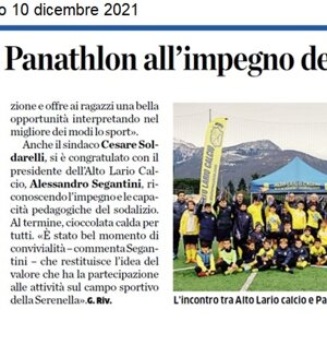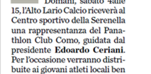 "Il Presidente Edoardo Ceriani e una delegazione di Panathlon Como ci raggiungeranno portando un graditissimo omaggio: 100 borracce ecologiche donate ai nostri giovani atleti calciatori. Ogni borraccia avrà il nome dell'atleta e i loghi di Panathlon e di Alto Lario Calcio. Questo momento rappresenta un grandissimo onore per noi ma anche un grande soddisfazione e un significativo riconoscimento alla nostra Società e al nostro Movimento da sempre in prima linea in difesa dei valori sportivi propri di Panathlon e condivisi con determinazione da tutti i membri dell'ASD Alto Lario Calcio".