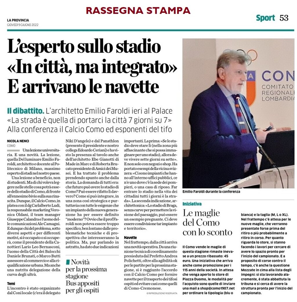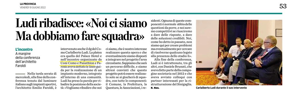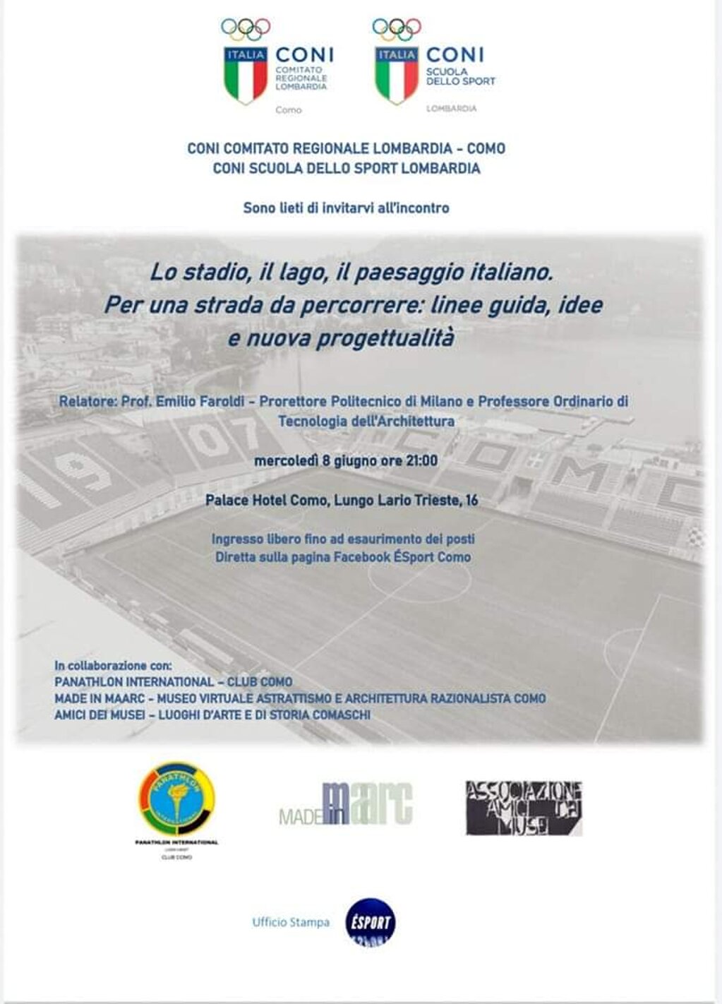 - Serata di grandissimo livello e aperta al pubblico mercoledì 8 giugno all’Hotel Palace di Como su “Lo stadio, il lago, il paesaggio italiano. Per una strada da percorrere: linee guida, idee e nuova progettualità”. Ringraziamo il nostro consigliere e Delegato provinciale Coni Niki D’Angelo per aver voluto al suo fianco il Panathlon comasco (al tavolo con lui il presidente Edoardo Ceriani), sempre attento alle dinamiche di attualità della città. Diversi i consiglieri e i panathleti presenti e collegati in streaming sulla pagina facebook di Èsport Como.