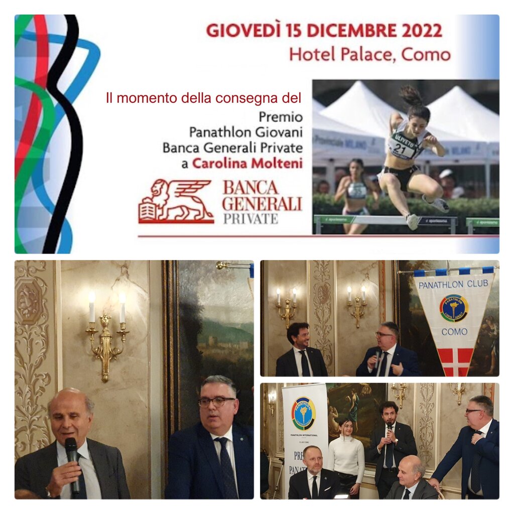 Allietata dalla presenza del presidente del Consiglio Regionale della Lombardia Alessandro Fermi, del Sindaco della città Alessandro Rapinese e di altre personalità pubbliche e ospiti dei soci, si è festeggiata CAROLINA MOLTENI per l'assegnazione del 33esimo premio PANATHLON GIOVANI BANCA GENERALI PRIVATE.