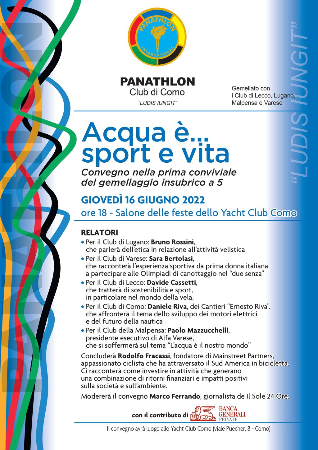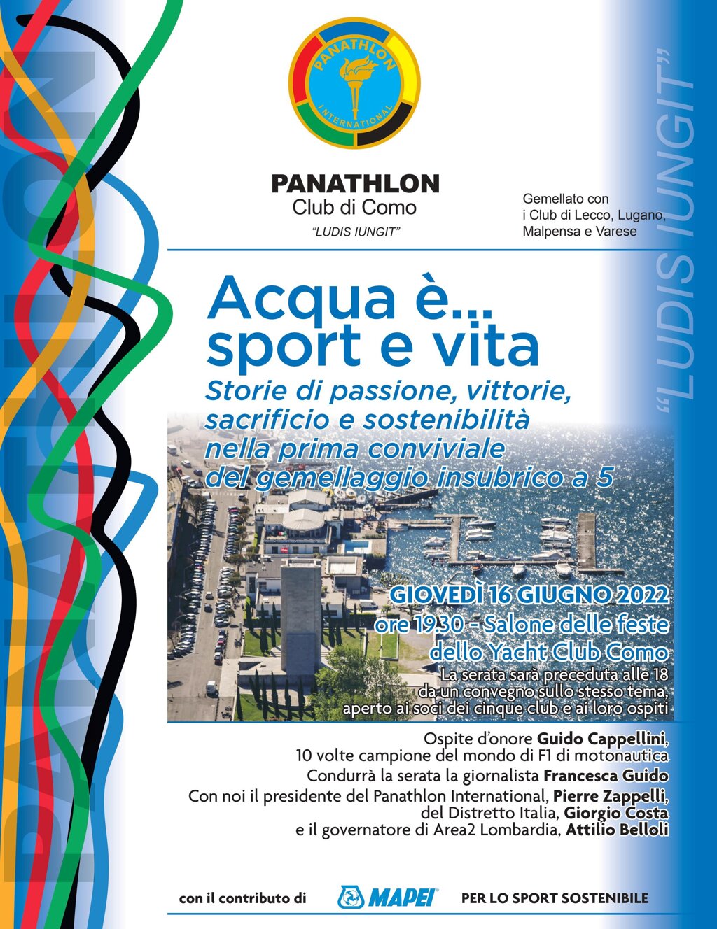 L’interessante e partecipata serata ha visto la presenza anche del presidente del club comasco Edoardo Ceriani. Nei saluti finali ha ricordato che per la prima volta il 16 giugno verrà organizzato un gemellaggio a cinque - novità assoluta perché fino all’ultimo incontro pre pandemia era riservato ai tre Club Como, Lugano e Varese - in quanto dal novembre 2019 si sono uniti anche i Club di Lecco e Malpensa. Sarà in Como in una delle location più prestigiose, lo Yacht Club, quindi affacciati sul lago. L’argomento scelto è “L’acqua” in senso lato, sia dal punto di vista agonistico che, soprattutto della sostenibilità. Sarà presente tutta la struttura apicale del Panathlon International e, ci si augura, una buona rappresentativa da tutti i Club gemellati.