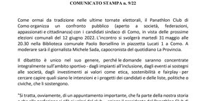 Serata molto partecipata e aperta alla città, organizzata dal Panathlon Club Como col principale scopo di favorire un dibattito, unico nel suo genere, a fronte di domande concentrate integralmente sull’ambito sportivo - dagli impianti all'inclusione, dagli eventi ai sostegni alle società, dagli investimenti ai valori come etica, sostenibilità e fairplay - per cercare capire quali fossero le intenzioni e i progetti dei candidati e delle liste, politiche o civiche, che li sostengono. "Lo dovevamo alla città - le parole del presidente Ceriani - unico confronto pre elettorale solo sui grandi temi dello sport".