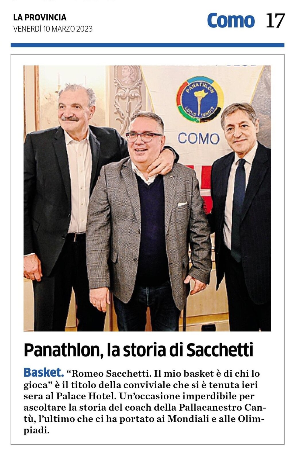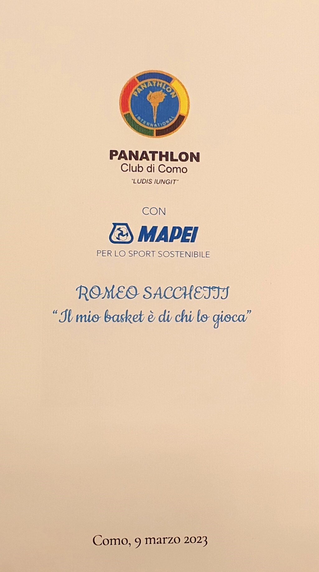 La serata tematica che il Panathlon Como ha proposto per il mese di Marzo è stata affidata a Meo Sacchetti e alla Pallacanestro Cantù. L’autore del libro “Il mio basket è di chi lo pratica”- titolo che il presidente del club Edoardo Ceriani aveva scelto per l’incontro - ha saputo comunicare emozioni attraverso racconti e aneddoti, ricchi di significati e valori. In apertura il GM della Pallacanestro Cantù, Alessandro Santoro, ha testimoniato l’umanità e la trasparenza dei rapporti con l’attuale allenatore della squadra canturina.
