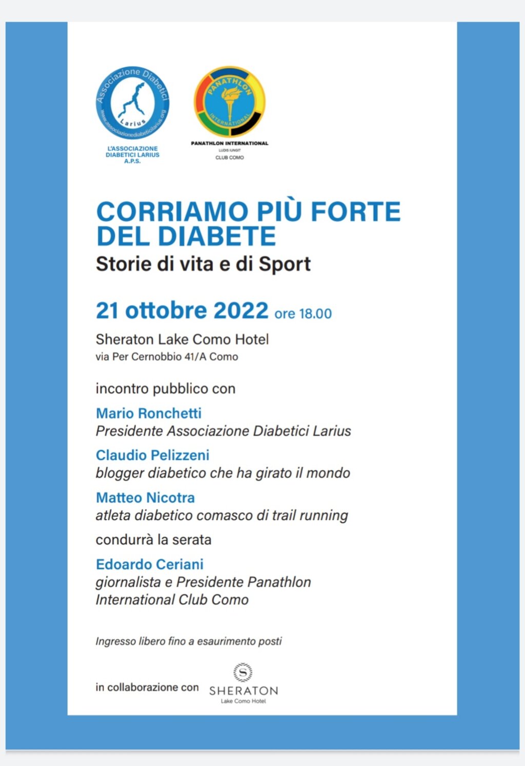 Uniti per fare informazione, incoraggiare alla prevenzione e ascoltare bei racconti.Si è svolto l'appuntamento dal titolo “Corriamo più veloce del diabete. Storie di vita e di sport”, grazie all’Associazione Diabetici Larius e al Panathlon International Club di Como venerdì 21 ottobre 2022 allo Sheraton Lake Como Hotel. E' Stata una vera occasione per i soci delle due associazioni, ma anche per i tanti interessati e per gli appassionati di sport e di letture.