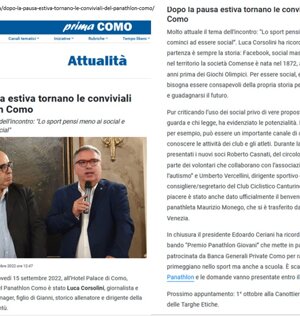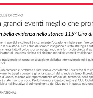 Giacomo Santini, direttore della Rivista internazionale del P.I. che raggiunge tutti i club nel mondo, dopo l’assegnazione del Premio mondiale 2020 SEZIONE INTERNET SOCIAL al nostro Club scriveva che “tra tutti i club concorrenti, Como ha dimostrato di avere saputo armonizzare varie componenti che moltiplicano l’effetto informativo in varie direzioni (…) forte della sua storia e della penetrazione che dimostra di avere nel tessuto sociale e sportivo in cui opera, grazie all’impegno dei suoi dirigenti e di chi crede da tempo nel ruolo dell’informazione”. È con grande piacere che pubblichiamo quanto da lui presentato nella RIVISTA INTERNAZIONALE del P.I. n. 1 gennaio/aprile 2022in un articolo dal titolo “Distretto Italia - Panathlon Como - INSERIRSI IN GRANDI EVENTI MEGLIO CHE PROMUOVERNE - Il Panathlon in bella evidenza nello storico 115° Giro di Lombardia”.