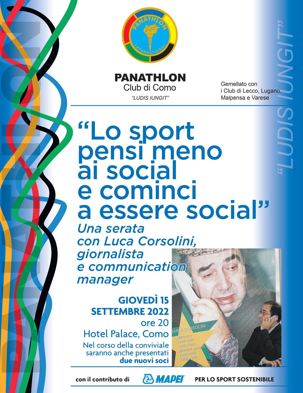 15 settembre 2022: conviviale con Luca Corsolini. Tema della serata "Lo sport pensi meno ai social e cominci a essere social".