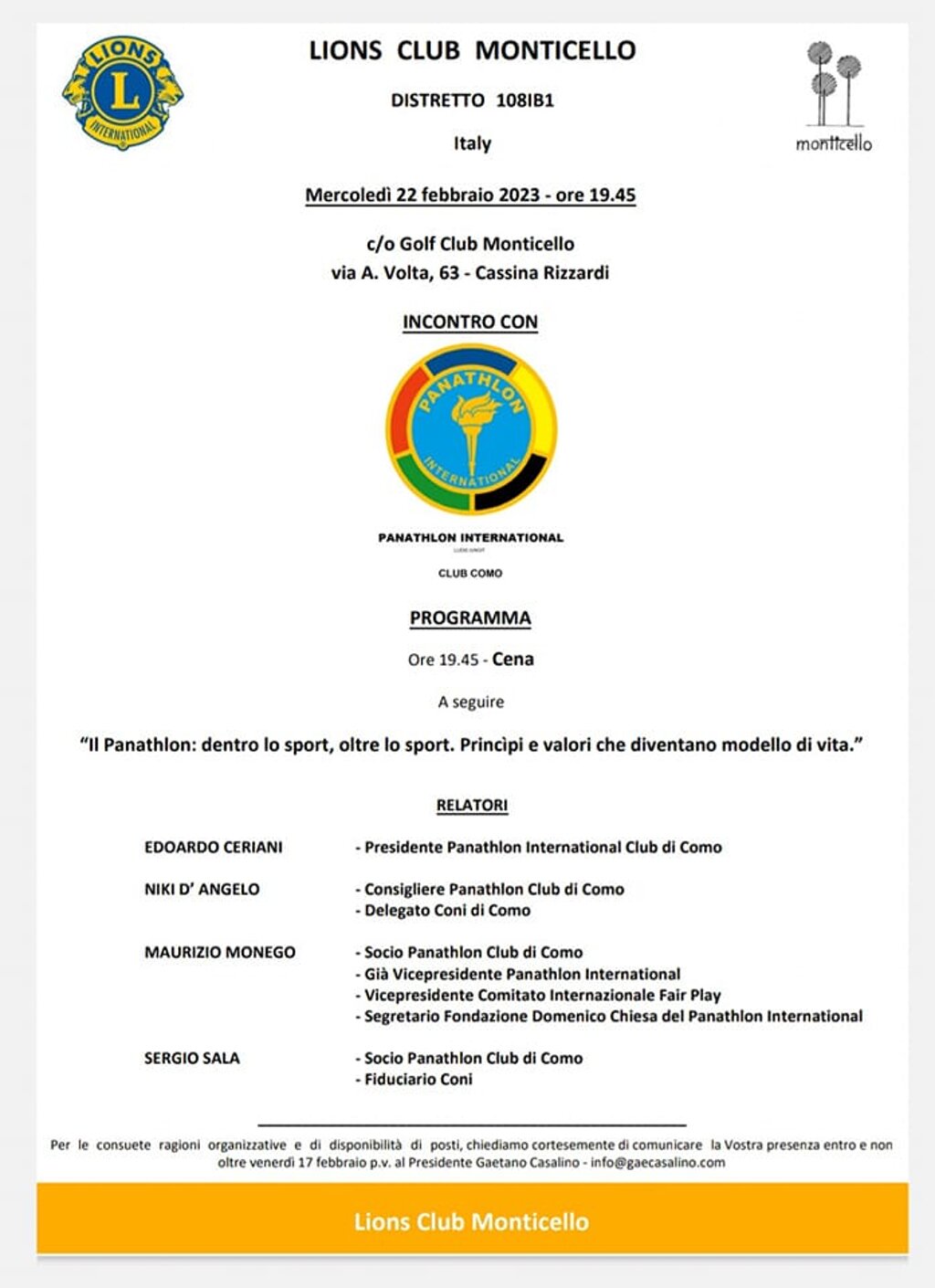 Le parole del presidente Edoardo Ceriani: "Un enorme grazie a Gaetano Casalino (a destra nella foto), presidente del Lions Club Monticello, che ha accolto con estrema cortesia e grande simpatia il Panathlon Club Como nella conviviale di febbraio".