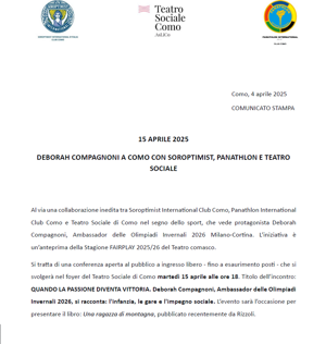 Il Teatro, in sinergia con Panathlon Como, CONI Comitato Provinciale di Como e Società dei Palchettisti, ha organizzato questo incontro con le associazioni sportive della provincia di Como per coinvolgerle nell'attuale Stagione 2025/26 dedicata allo SPORT e a tutti gli atleti, per diffondere cultura in preparazione ai Giochi Olimpici Invernali 2026 Milano-Cortina.