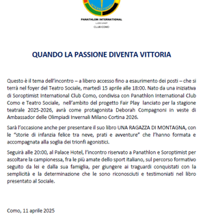 Il Panathlon International Club di Como è stato coinvolto, insieme al Coni provinciale e con Società dei Palchettisti, a collaborare con il teatro Sociale per organizzare la stagione 2025/26 dedicata allo sport.