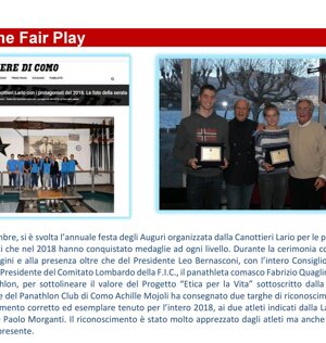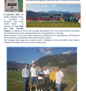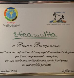 Alla presenza del consigliere Claudio Chiaratti è stata consegnata una targa FairPlay del Panathlon Club Como a Pietro Bertin dell'asd Cabiate calcio per il gesto compiuto. Dopo aver commesso un brutto fallo su un avversario si scusava prima col giocatore e poi con l’allenatore della squadra avversaria. Premio consegnato da asd Veniano calcio, Società firmataria della carta dei diritti del bambino nello sport.